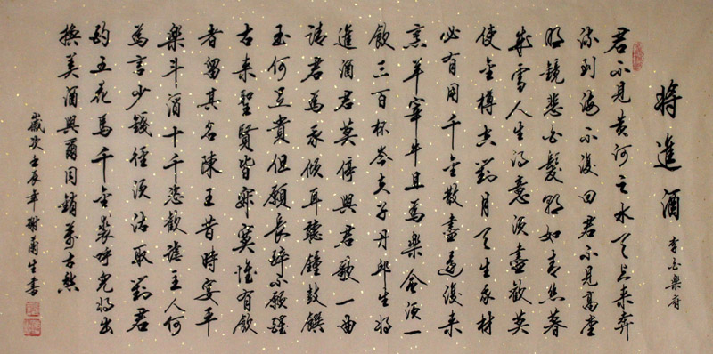 第二句“君不見高堂明鏡悲白發(fā),朝如青絲暮成雪?!?/p> 這句話用了排比來呼應(yīng)第1句,意思要表達(dá)人生苦短,時光匆匆,兄弟們,喝吧,你看早上照鏡子還是一頭黑發(fā),晚上就變白了。 前兩句又是時光不會倒流,又是人生苦短,開篇立意一起,目的就是要你喝酒,而且要及時喝酒。不得不說李白勸酒,勸出了高水平。 接著他又說“人生得意須盡歡,莫使金樽空對月?!钡靡獾臅r候要盡情的歡樂,喝吧喝吧,別讓壇中美酒白白放在那里了。前三句,只字不提酒,句句讓你喝。 “烹羊宰牛且為樂,會須一飲三百杯。”“會須”就是必須,一定要的意思。這句話一定要把“烹”字和“宰”以及“三”字發(fā)重音,重重的大聲讀出來,就像咱們喝酒劃拳一樣,才能讀出李白當(dāng)時的心情。這句話意思是你要么不喝,要喝酒喝三百杯,當(dāng)然咱們中國詩詞里的數(shù)字都喜歡用夸張手法。不過這氣勢當(dāng)時就嚇壞了在座的兩位朋友。 “岑夫子,丹丘生,將進(jìn)酒,杯莫停!”岑夫子就是岑勛,丹丘生叫元丹秋,都是李白的好兄弟,好朋友,這兩位一聽完上一句就趕緊把酒杯放下,真喝不了了,剛放下酒杯就被點名,你可以腦補(bǔ)一下李白一手拿酒,一手指著這兩位的畫面,你這兩個家伙,杯子端起來,快喝酒,不要停! “與君歌一曲,請君為我傾耳聽。”這又是大家熟悉的環(huán)節(jié)了,吹完牛皮,熊完不喝酒的人,接下來就是才藝表演環(huán)節(jié)了,誰還沒經(jīng)歷過這種場面,那你一定是太年輕了。 接下來是他唱的歌?!扮姽酿傆癫蛔阗F,但愿長醉不愿醒?!薄扮姽酿傆瘛笔谴腹γ毁F,說功利祿都不重要,都沒用,我只想喝醉。 “古來圣賢皆寂寞,惟有飲者留其名?!睆墓胖两竦氖ベt,死了之后就籍籍無名了,沒有人記得了,“寂寞”了,只有喝酒的人的名字才會被人記得,兄弟們,你要想永垂不朽流芳百世,就跟我一起喝酒吧! 這時候就已經(jīng)喝嗨了,開始說歪理,講胡話了。 “主人何為言少錢,徑須沽取對君酌。”怎么會沒錢呢?現(xiàn)在談什么錢呢?沒勁!只管喝酒! “五花馬。千金裘,呼兒將出換美酒?!边@里的“兒”可能是他的兒子,也可能指侍童。李白說:“小子,去把我的馬,我的袍子拿去當(dāng)了!給老子換酒來!”看來他是真的沒錢了,也印證了前面那句“千金散盡還復(fù)來”是吹牛的。 “與爾同銷萬古愁”,充滿了感情 色彩,也是這首勸酒歌流傳百世的點睛之筆